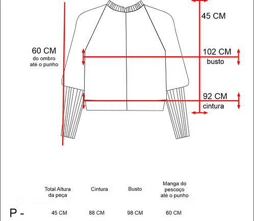 Esta peça tem modelagem cropped regular. Consulte a tabela de medidas para escolher seu tamanho ideal. Em caso de dúvida entre dois tamanhos, sugerimos o maior para mais conforto térmico.