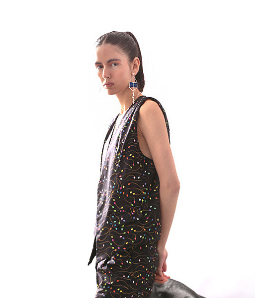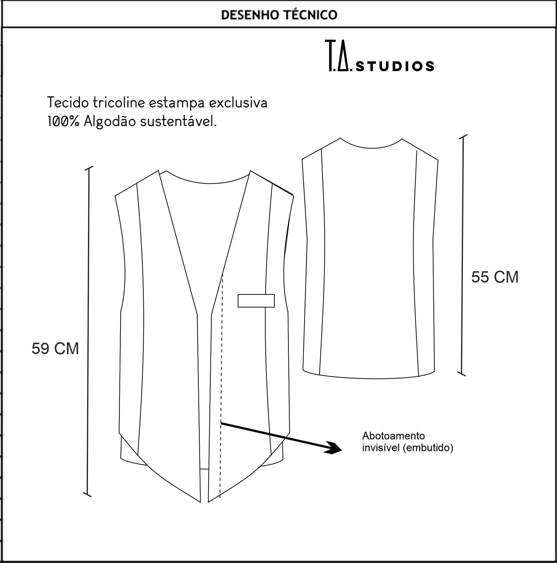 O Colete Estampa Pipas é a peça que une arte autoral, sofisticação e conforto absoluto. Com estampa exclusiva Pipas da TA Studios, este colete traz um toque de leveza e poesia ao guarda-roupa consciente. Confeccionado em tricoline e algodão brim de maior gramatura, oferece estrutura impecável e durabilidade. Totalmente forrado para acabamento premium, conta com abotoamento interno invisível que mantém as linhas limpas e elegantes. Com altura frontal de 59 cm e costas com 55 cm, o caimento valoriza a silhueta com sofisticação atemporal.