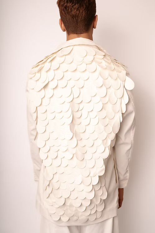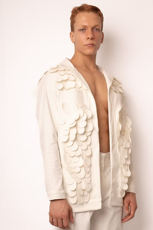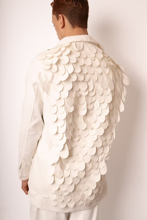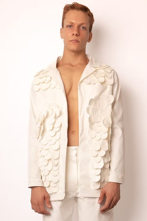 Jaqueta Penas Aplicadas: Arte Manual em Algodão Estruturado
