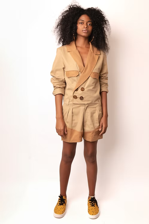 O Macacão Blazer combina a sofisticação de um blazer com a praticidade de um macacão. Com seis bolsos estratégicos, botões frontais de madeira e short interno forrado, é a peça versátil que transita do trabalho ao fim de semana com elegância.