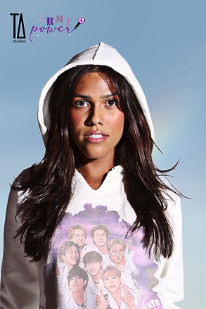 Este é um moletom exclusivo TA Studios da campanha Army Power 2022, agora em versão especial com capuz e mangas longas. Apresenta estampa frontal exclusiva "Mic Drop", capuz ajustável, mangas longas com punho e bolsos laterais com abertura. Composição: 67% poliéster reciclado, 26% algodão e 7% linho. Esta peça é um arquivo histórico de 2022 que celebra a união da comunidade ARMY pela saúde mental, com parte das vendas destinada ao projeto Saúde Army.